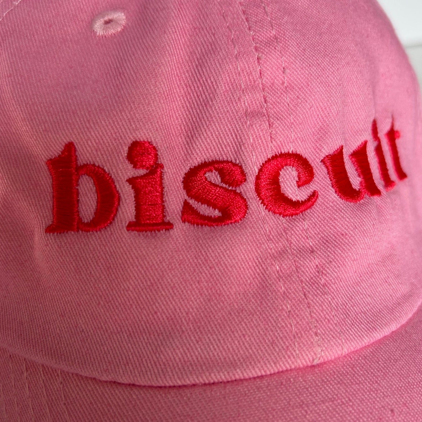 Pink dad hat with red embroidery. Adjustable closure at the back.